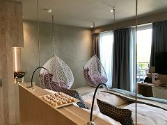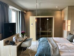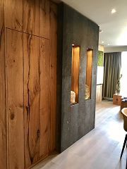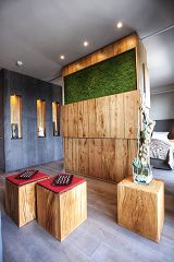 Der als L-Baukörper konzipierte Neubau mit vier Geschossen bietet Platz für 16 individuell ausgestattete Doppelzimmer, sowie 4 Suiten, die sich im Staffelgeschoss befinden. Dabei ist der Neubau mit dem bestehenden Komplex verbunden. Somit entsteht ein Ensemble für die Hotelgäste, die das monte mare SAUNA-SPA-SPORTS mitbenutzen können, ohne die Anlage verlassen zu müssen. Die vier Suiten sind den Elementen gewidmet und sie finden sich in der Innenraumgestaltung, als Thema, wieder. Die Gäste werden in einem Wohlfühlambiente empfangen und können gleichzeitig die Themen des bestehenden Angebotes nutzen.