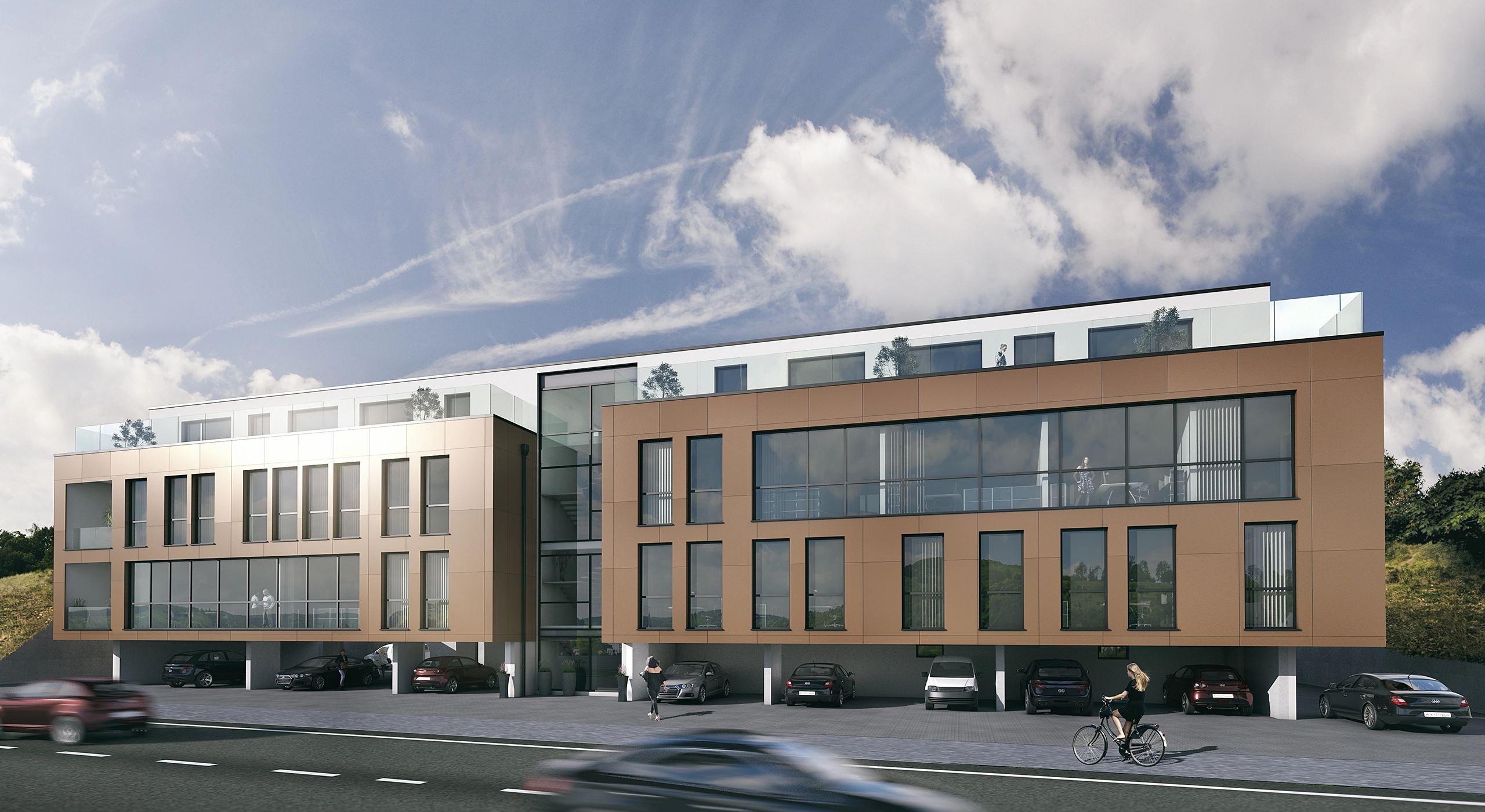 An der Brunnenstraße in Bad Breisig entstand auf dem Gelände des ehemaligen Parkschlösschens ein neuer, gemischt genutzter Büro- & Gewerbekomplex, bestehend aus einem Bürogebäude und Lagerhallen. Beides in Einklang zueinander und an markanter Stelle des Ortseinganges aus Richtung Koblenz (B9).  Das Bürogebäude mit seinen grosszügigen Glasflächen und seiner strukturierten Fassaden bietet viele Möglichkeiten in der Gestaltung des multifunktionalen Grundrisses. So entstanden moderne, attraktive und lebendige Nutzungsmöglichkeiten. Das Leben und Arbeiten in diesen Räumlichkeiten eröffnet dadurch eine Wohlfühlatmosphäre mit besonderem Rhein-Blick.