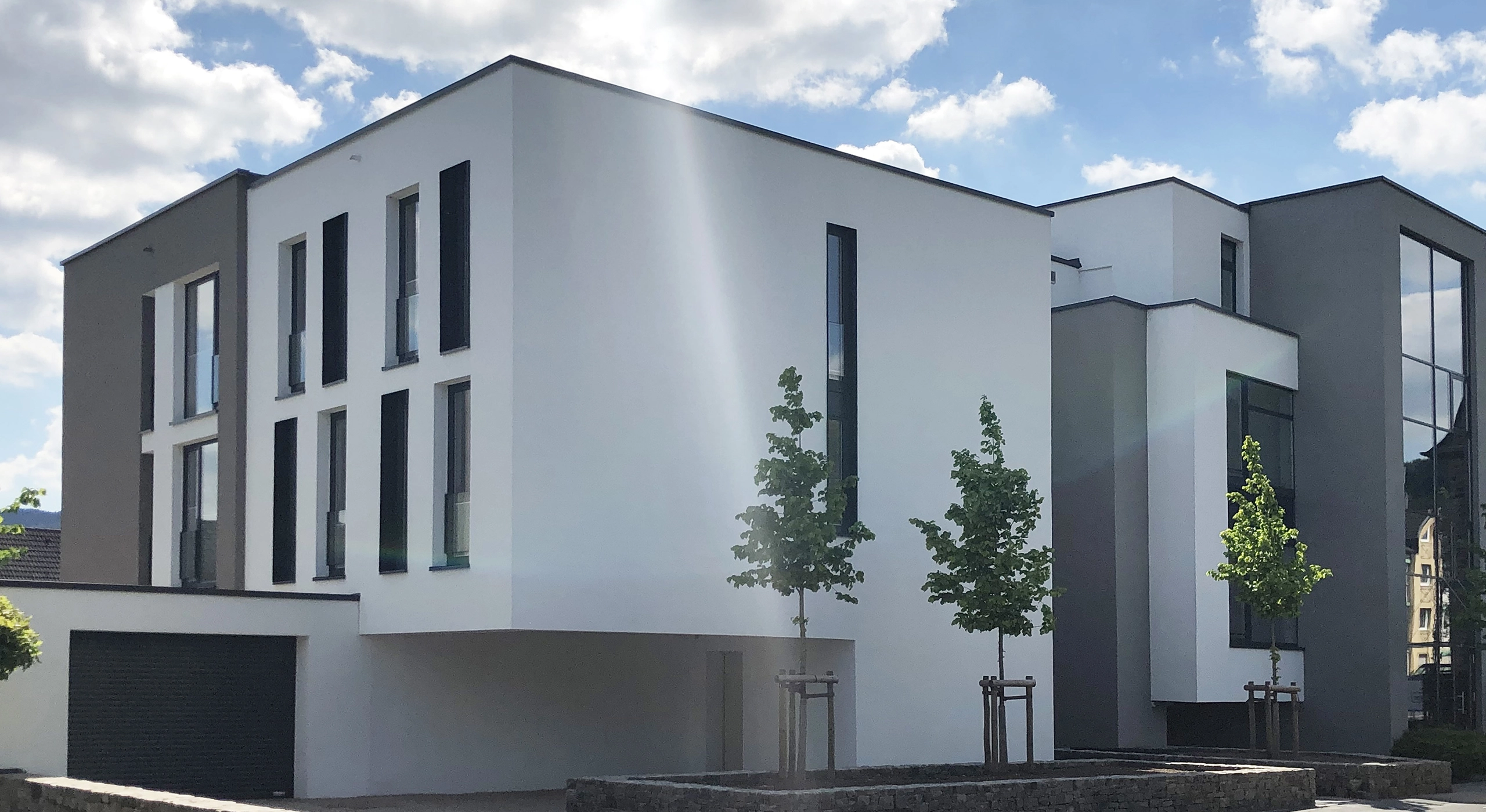 Auf dem ehemaligen Bahnergelände entstand ein klar strukturierter Neubau, der sich sensibel in die umgebende Bebauung einfügt. Das dreigeschossige Wohnhaus verbindet moderne Architektur mit funktionaler Aufteilung: zwei großzügige Eigentumswohnungen in den Obergeschossen, Nebenräume und Stellplätze im Erdgeschoss. Helle Glasflächen, glatte Putzoberflächen in Weiß und Grau sowie Naturstein aus Ahrwacke prägen das Erscheinungsbild und schaffen eine ruhige, zeitlose Eleganz.